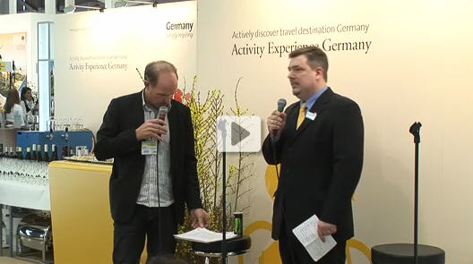 Präsentation des Reisezieles Rheinland-Pfalz vor Vertretern der schwedischen Presse auf der TUR - Messe in Göteborg 2009. Co-Moderator ist der ehemalige schwedische Fussballnationaltorwart Tomas Ravelli: